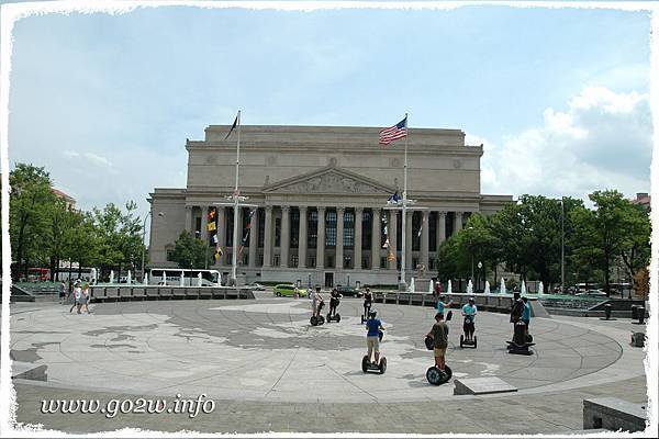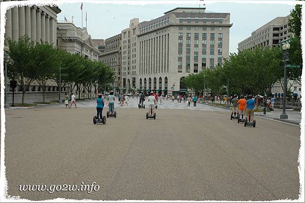 上路後,第一站是美國國家檔案館(Archives of the United States of America)。我們在這裡停留5分鐘,拍一些照片。其實這一段路只是暖暖身,導遊事先把賽格威的最快速度調慢,以確保安全。看到大家都可以熟稀操作後,才把速度調成正常。