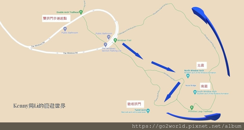 結束後,繞著北窗,沿著原始步道 (Primitive Trail) 走回停車場。