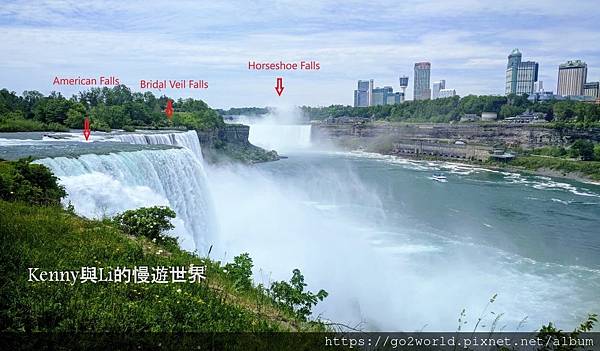 馬蹄形瀑布橫跨於美加邊境,新娘紗瀑布和美國瀑布兩條瀑布都在美國境內,因為瀑布都面朝加拿大,要在加拿大才可ㄧ覽三條瀑布的全貌,在美國這邊只能看到側影(如上圖)。不過在美國這邊可以近距離的感受尼加拉河的水勢澎湃,厖大的水量衝下斷崖,氣勢磅礴,令人震撼。