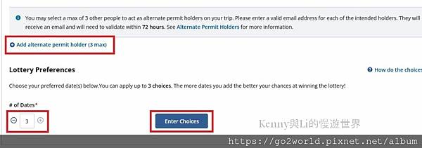 - Alternate Permit Holder: 申請人是許可證持有者(Permit Holder),抽中的日期當天必須到場,不然整組許可證作廢,要避免這種形況發生,可以加上其他組員的名字和email當作Alternate Permit Holder,其他組員要在72小時內回email認正。