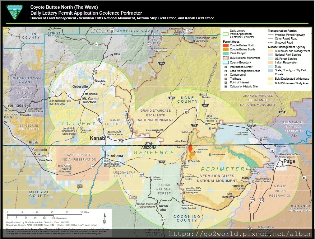 波浪谷位於美國亞利桑那州野外保護區(Paria Canyon-Vermilion Cliffs Wilderness)的狼丘北(Coyote Buttes North)區內,由Burau of Land Management (BLM)管理。 既然稱作Wilderness(荒野地區),那就是未開發的荒.....郊.....野.....外啊!