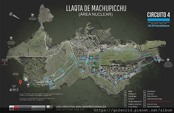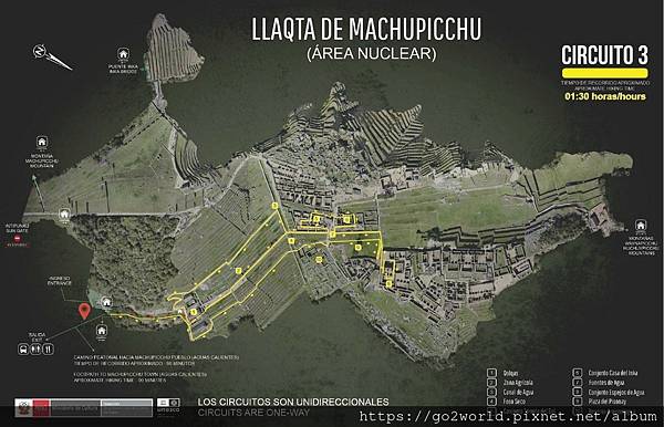 路線: 官方地圖標示的入口和Circuit 1和2不同,很可能在大門口就兵分兩路,到現場時要和工作人員確認。這條路線不能拍到馬丘比丘的經典角度,會先穿過倉庫和梯田,沿路經過印加屋區,太陽神殿 / 皇陵,噴泉,水鏡,最後經過監獄廣場和考古保護區,由原路離開。