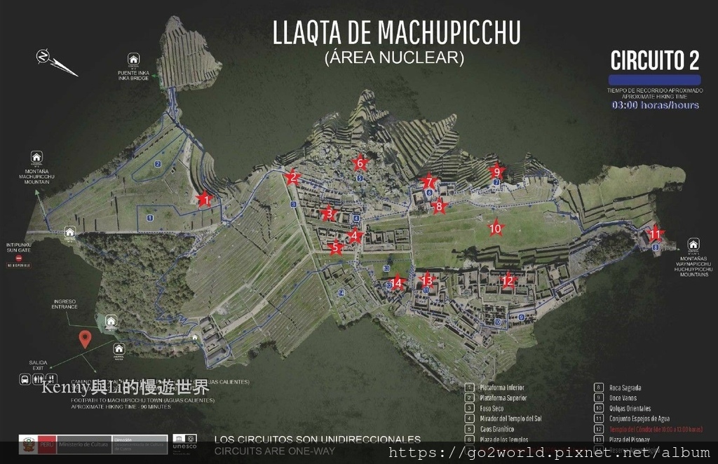 我在Circuit 2 的地圖標示了14個馬丘比丘的重要景點,下面還有它們的中、英文對照,希望對大家有所幫助。