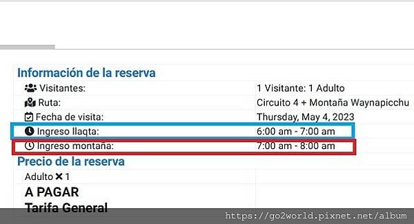這組套票有進入馬丘比丘大門的時段 (Ingreso llaqta-藍色框框) 和進入瓦納比丘的時段 (Ingreso montaña-紅色框框),會提早1小時進入馬丘比丘; 瓦納比丘的入口是在聖石旁邊,從馬丘比丘大門走到瓦納比丘入口,不逗留要20分鐘,在瓦納比丘入口要再次驗票、簽到。