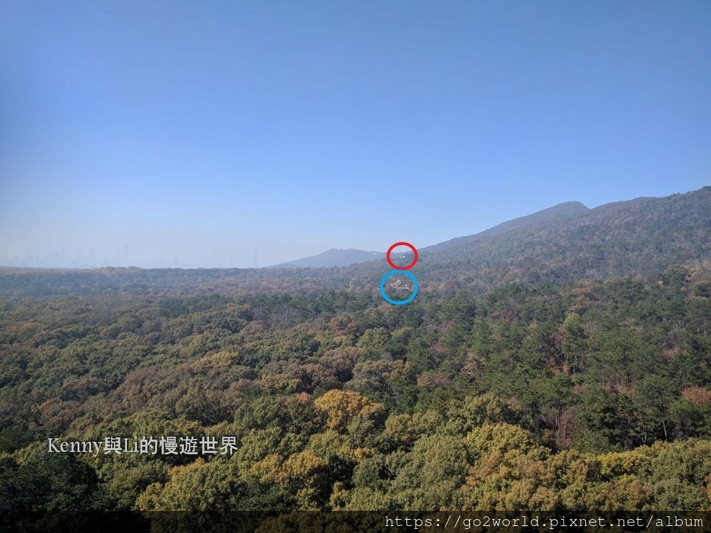 西面望去,隱隱約約可以看到中山陵的祭堂 (紅色圓圈) 和藏經樓 (藍色圓圈)。