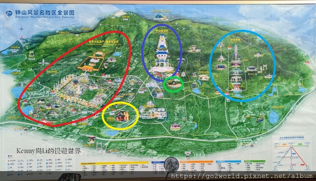 鐘山風景區套票包含了四個景點: 明孝陵景區(下圖紅色圈)、美齡宮(下圖黃色圈)、音樂台(下圖綠色圈)、靈谷景區(下圖淺藍色圈)。